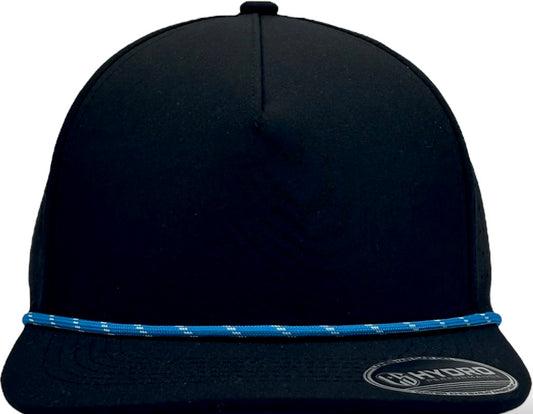 5 Panel Black Rope Hat with Sapphire Blue/White Rope Snapback
